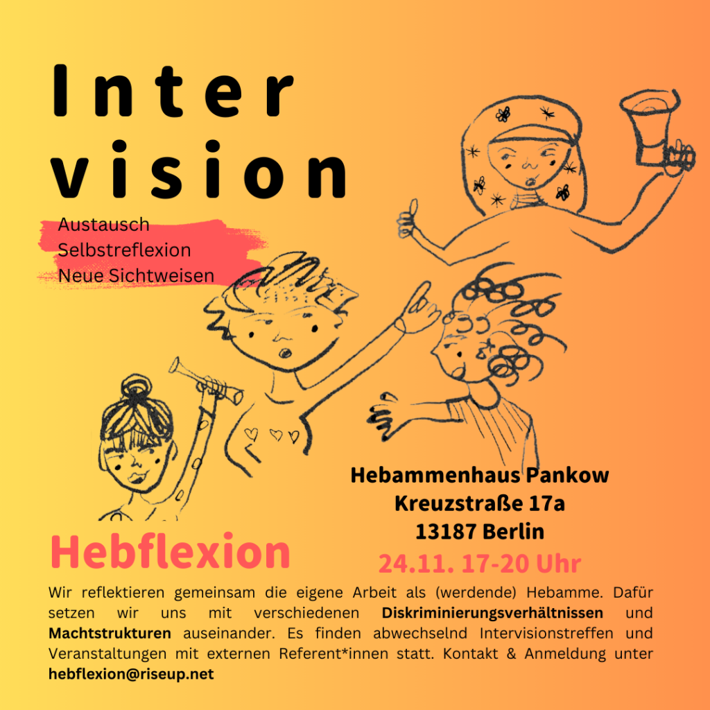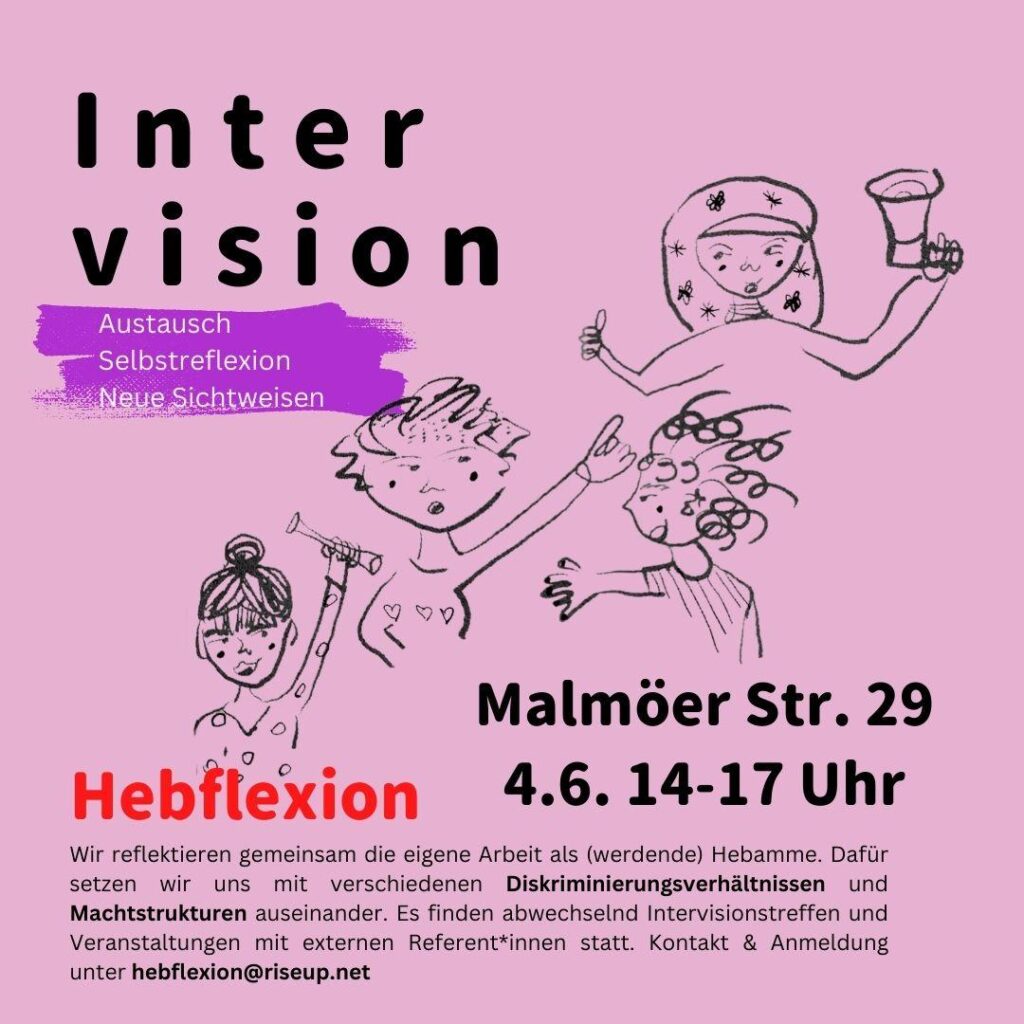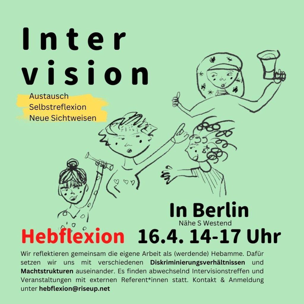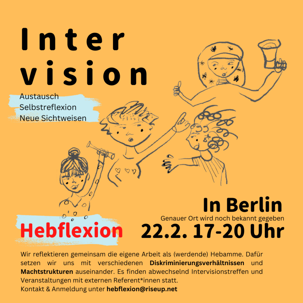 Bei einer Intervision beleuchten wir gemeinsam eine Situation, Fall oder Fragestellung aus unserem Hebammenalltag. Dabei reflektieren wir, wie bestehende Machtverhältnisse und Diskriminierungsstrukturen wirken, was unsere Anteile daran sind und wie wir diesen etwas entgegensetzen können. Wir versuchen dabei, einen safer space zu kreieren. Neue Personen sind immer willkommen! (Voranmeldung nicht notwendig, für den Überblick könnt ihr euch gern melden: hebflexion@riseup.net)
