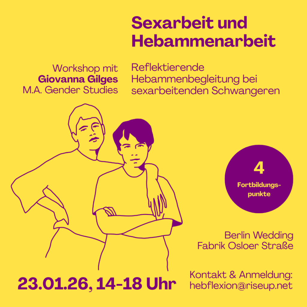 Um Wissen zu bündeln und Perspektiven zu erweitern, gibt Giovanna uns zu Beginn einen rahmengebenden Input, u.a. zum rechtlichen Umgang mit sexarbeitenden Schwangeren, der Heterogenität von Sexarbeit und Einblicke in ihre Forschungsarbeit zum Schwangersein in der Sexarbeit. Anschließend erarbeiten wir gemeinsam die Begrenzungen und Potenziale der Hebammenbegleitung von sexarbeitenden Schwangeren und tauschen uns über Erfahrungen aus, reflektieren Haltungen und entwickeln professionelle Handlungsmöglichkeiten für die Praxis.